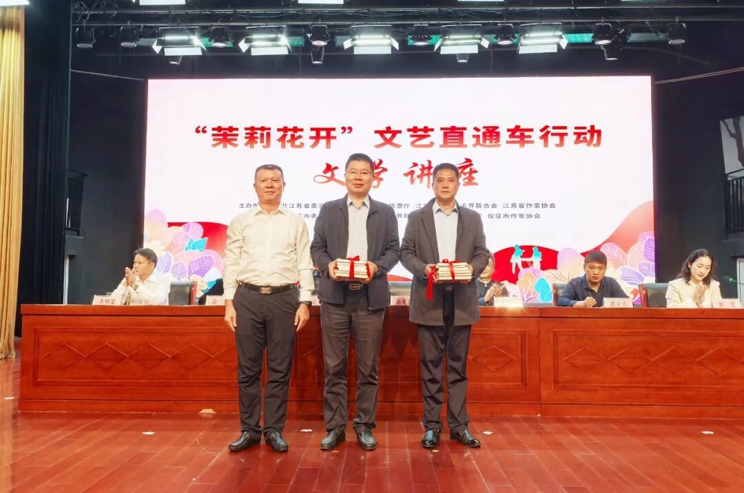 金秋十月,书香满溢。2025年10月14日下午,“茉莉花开”文艺直通车行动文学讲座如约而至,江苏省作协组织省、市文学大咖,携优质文化资源走进仪征,为我市社区居民与师生送上一场浸润心灵的文学盛宴,让优质文化资源跨越距离,在仪征播撒书香种子。江苏省作协党组成员、书记处书记杨发孟,江苏省作协副主席、儿童文学作家祁智,江苏省作协联络部二级调研员潘剑,扬州市作协主席周荣池,儿童文学作家徐瑾,仪征市委宣传部副部长、文联主席刘霞,仪征市作协主席李明富参加活动。