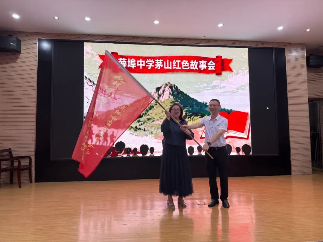当日下午,薛埠中学的红色主题宣讲现场暖意融融。金坛区关工委法治教育宣讲团成员朱金荣、一级作家葛安荣、区教育局基础教育科科长朱春平、区全民阅读促进会韩献忠会长、薛埠中学校长丁华宇、薛埠社区教育中心主任廖秋保等与全校200多名师生共赴精神盛宴。活动伊始,薛埠中学德育处倪春慧主任总结故事宣讲队近年工作并发布三年发展规划,接着区教育局朱春平科长向薛埠中学故事宣讲队队长盛杰授予“薛埠中学红色故事宣讲队”队旗,标志着小小宣讲队正式“启航”。