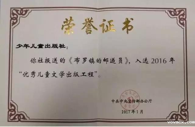 2017年1月16日下午,由中共中央宣传部办公厅组织的2016“优秀儿童文学出版工程”评选结果在京揭晓。这次全国各出版社共报送了一百多部作品,经过专家评审组几轮严格审读,其中七部作品入选。上海世纪出版股份有限公司少年儿童出版社出版的《布罗镇的邮递员》以专家的一致好评以及最高分获得一等奖。
