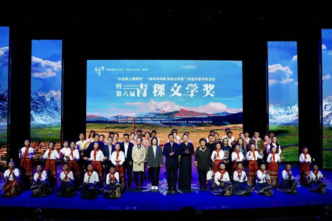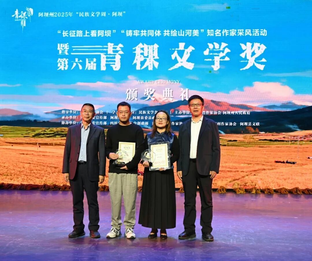 2025年9月8日晚,在“民族文学周·阿坝”活动期间,由民族文学杂志社提供学术支持,四川省作家协会、四川阿坝州人民政府主办的第六届青稞文学奖在四川阿坝州阿坝县颁奖。本届共评出5部获奖作品,江苏作家向迅(土家族)凭《欢迎来到纳休村》荣获散文奖,此外,陈萨日娜(蒙古族)的《跋山涉水》、翔虹(壮族)的《鱼挪活》、康若文琴(藏族)的《俄惹的雪》荣获中篇小说奖,周家琴的《大山褶皱深处的村庄》荣获散文奖。中国作协党组成员、书记处书记李一鸣,《民族文学》主编陈亚军、副主编朱钢,四川省人大常委会委员、省人大监察和司法委副主任委员、中国作协南亚国际文学交流中心执行主任、四川省作协副主席侯志明,四川省作协党组副书记鲁娟等出席颁奖典礼。